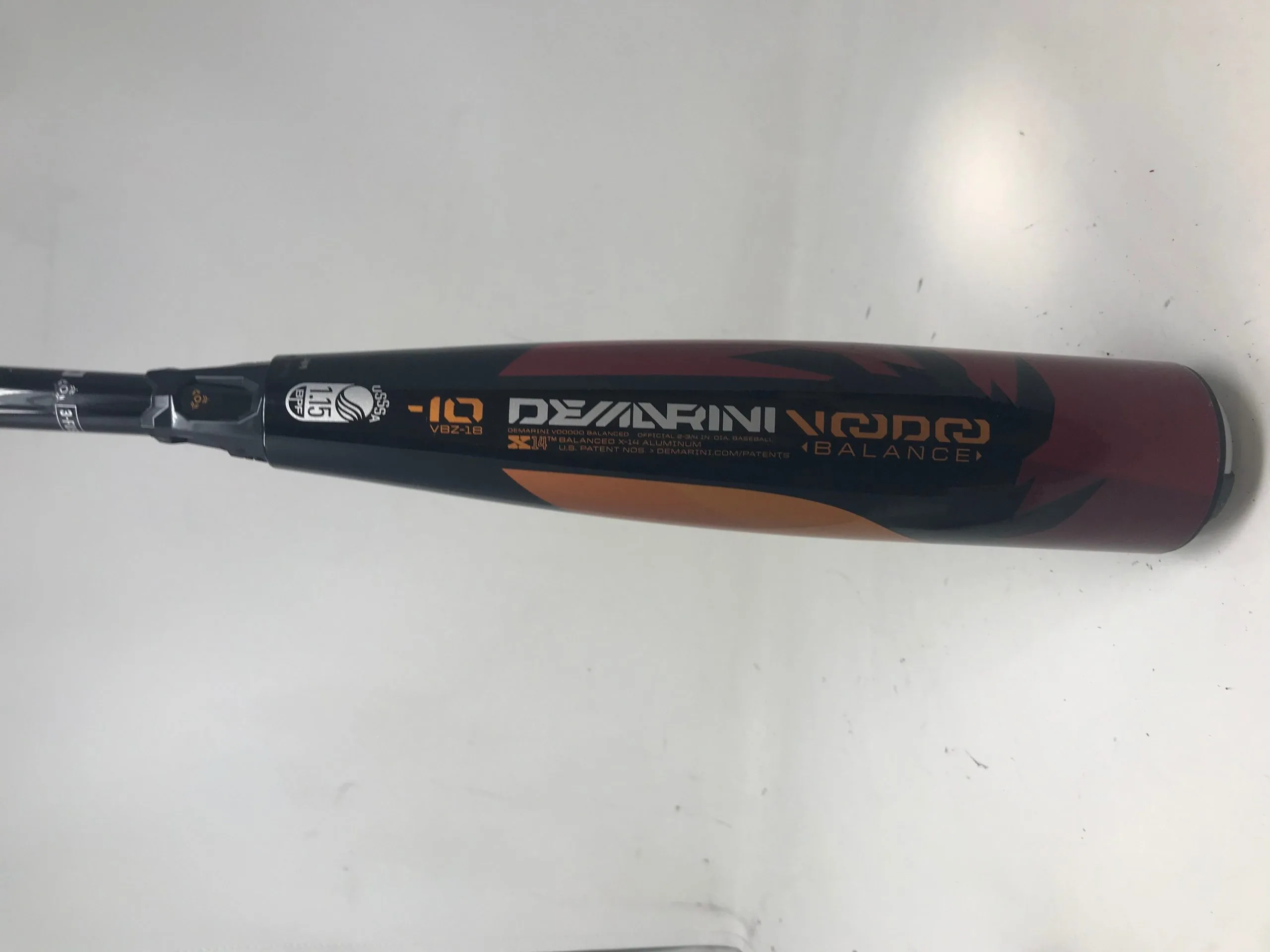 The DeMarini Voodoo features an X14 Alloy barrel that uses variable wall thickness. Using a two-piece, hybrid construction, the Voodoo offers the traditional sound of alloy bats but the light weight feel of composite bats. The variable wall thickness gives players more power at the plate.